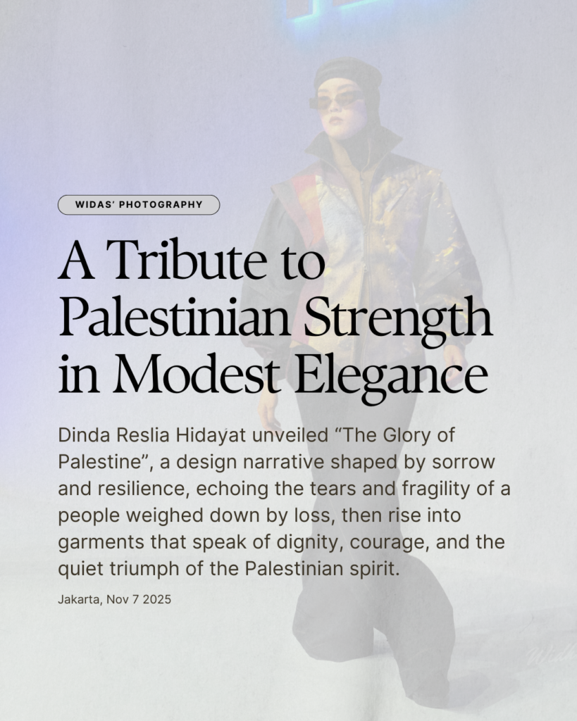 Dinda Reslia Hidayat unveiled “The Glory of Palestine”, a design narrative shaped by sorrow and resilience, echoing the tears and fragility of a people weighed down by loss, then rise into garments that speak of dignity, courage, and the quiet triumph of the Palestinian spirit.